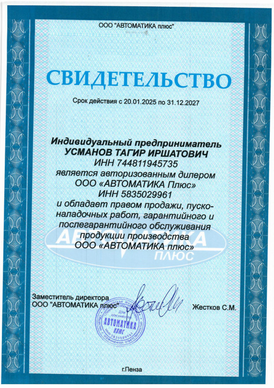 Сертификат дилера ООО "АВТОМАТИКА Плюс"